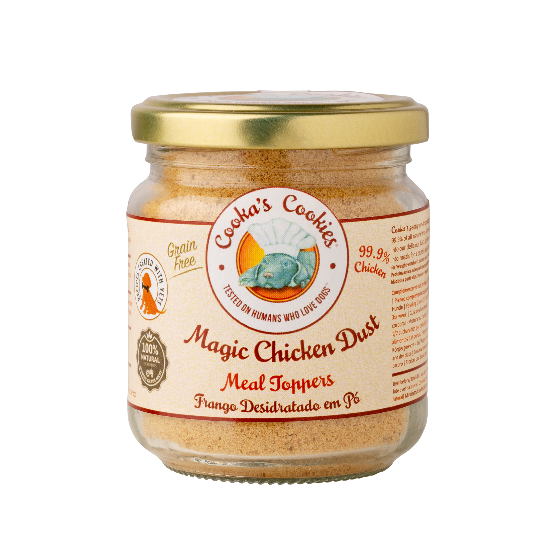 Cookaâs Magic Chicken Dust Ă€r en smakrik och naturlig meal topper som gör varje mĂ„ltid oemotstĂ„ndlig. Tillverkad av 100 % mĂ€nskligklassad kycklingbröstfilĂ©, varsamt lufttorkad och finmald till ett lĂ€ttanvĂ€nt pulver.