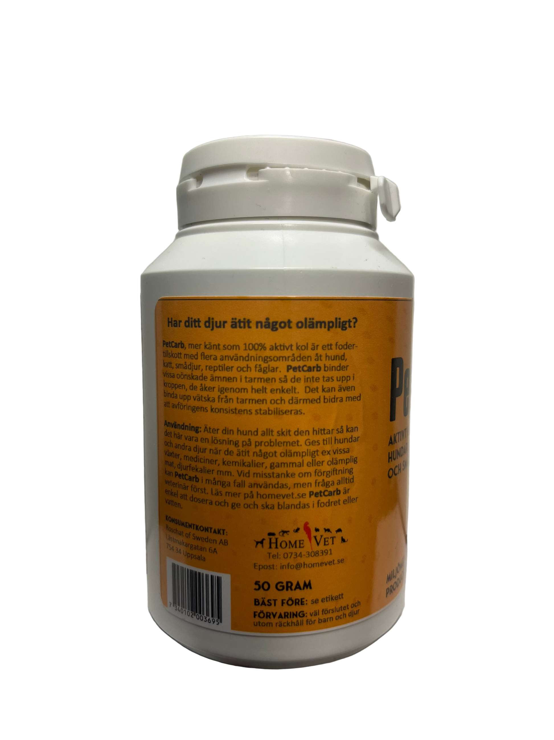 Det kan även binda upp vätska och kan därmed bidra med att avföringens konsistens stabiliseras. PetCarb bör finnas i djurens husapotek!